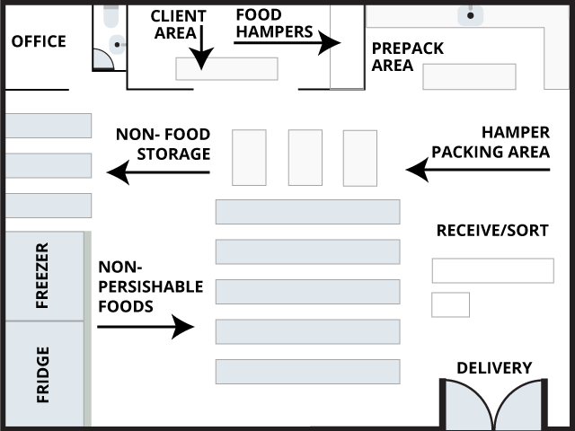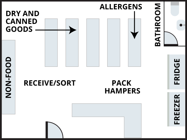 When designing a space for your food bank, it is important to consider the flow of how your employees and volunteers will work in the space. It is also important to consider how the space itself can support safe food handling.